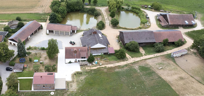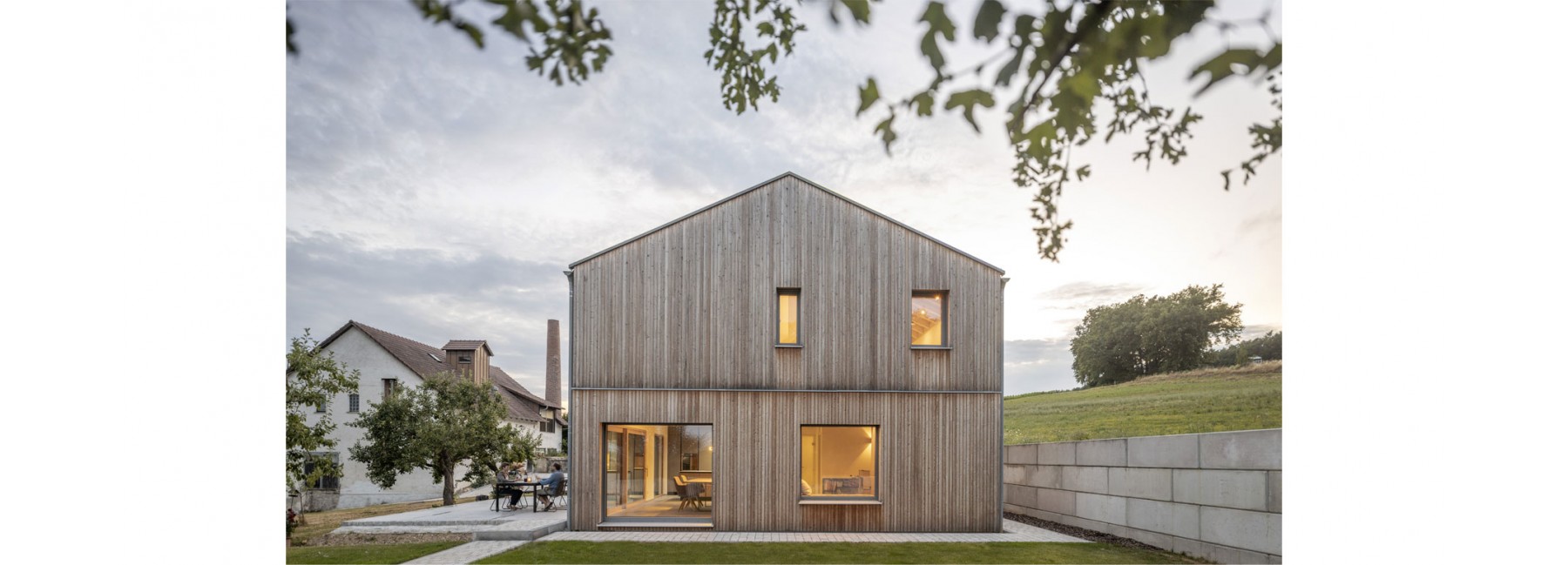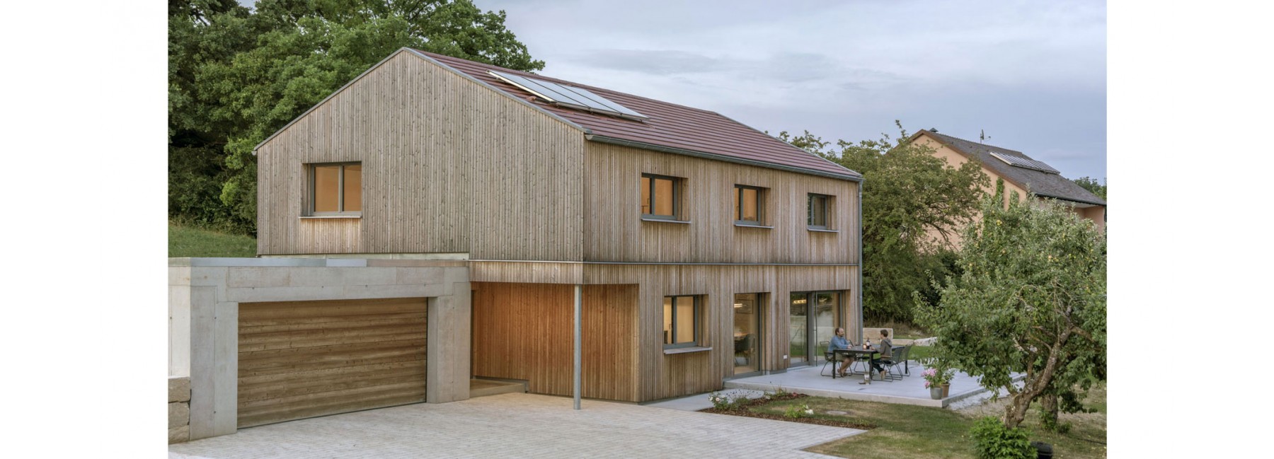 Klare Vorstellungen prägten von Beginn an den Entwurf des neuen Zuhauses: Ein Holzhaus mit klassischem Satteldach, großzügigem Sitzfenster, sichtbarer Holzdecke im Erdgeschoss und offenem Sichtholzdachstuhl im Obergeschoss. Die konsequent ausgeführte Holzfassade unterstreicht den natürlichen Charakter des Gebäudes. Kochen, Essen und Wohnen öffnen sich zum Garten hin, während die privaten Rückzugsräume bewusst im Obergeschoss angeordnet sind. Errichtet wurde das Einfamilienhaus auf dem elterlichen Gutshof der Bauherrin – einer lebendigen landwirtschaftlichen Hofstelle mit Ackerbau, freilaufenden Hühnern und Ziegen. Der Holzbau war dabei eine bewusste Entscheidung: ökologisch sinnvoll, präzise vorgefertigt und mit kurzer Bauzeit realisiert. Im Erdgeschoss bildet der offene Wohn-, Ess- und Kochbereich das Zentrum des Hauses. Eine angrenzende Speise, ein kleines Büro, Technikraum und Gäste-WC sorgen für Funktionalität im Alltag. Eine Faltwerktreppe aus Eiche führt ins Obergeschoss mit drei großzügigen Kinderzimmern, Kinderbad, Elternschlafzimmer, separater Ankleide und einem weitläufigen Elternbad. Hier schafft naturgeöltes Eichenparkett in Landhausdiele eine warme Wohnatmosphäre. Ein besonderes Highlight ist das große Sitzfenster. Es hat sich schnell zur beliebtesten Wohnzone der Kinder entwickelt und bietet einen direkten Blick in den Garten. Die Südausrichtung des Hauses eröffnet zudem eine herrliche Sicht auf die Obstbäume. Ergänzt wird das Ensemble durch eine angegliederte Garage aus Sichtbeton mit Holztor, die dem Gesamtbild einen modernen Akzent verleiht. Das Ergebnis ist ein hochwertiges, lichtdurchflutetes Zuhause, das die Werte der Familie widerspiegelt: Natürlichkeit, Präzision und Lebensqualität. Von der Terrasse aus die Natur zu sehen und zu spüren – das ist Idylle und Landleben pur.